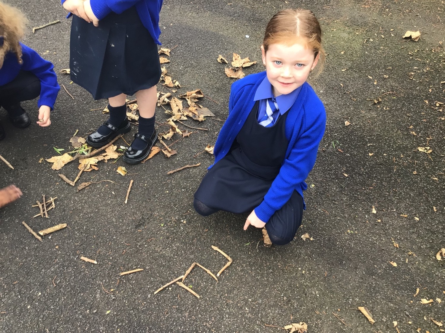 As part of Maths Week Ireland Primary 3 used our beautiful grounds to explore in our natural world. Children used twigs and leaves to create 2D shapes and numbers. Some children used meter sticks to measure the playground.